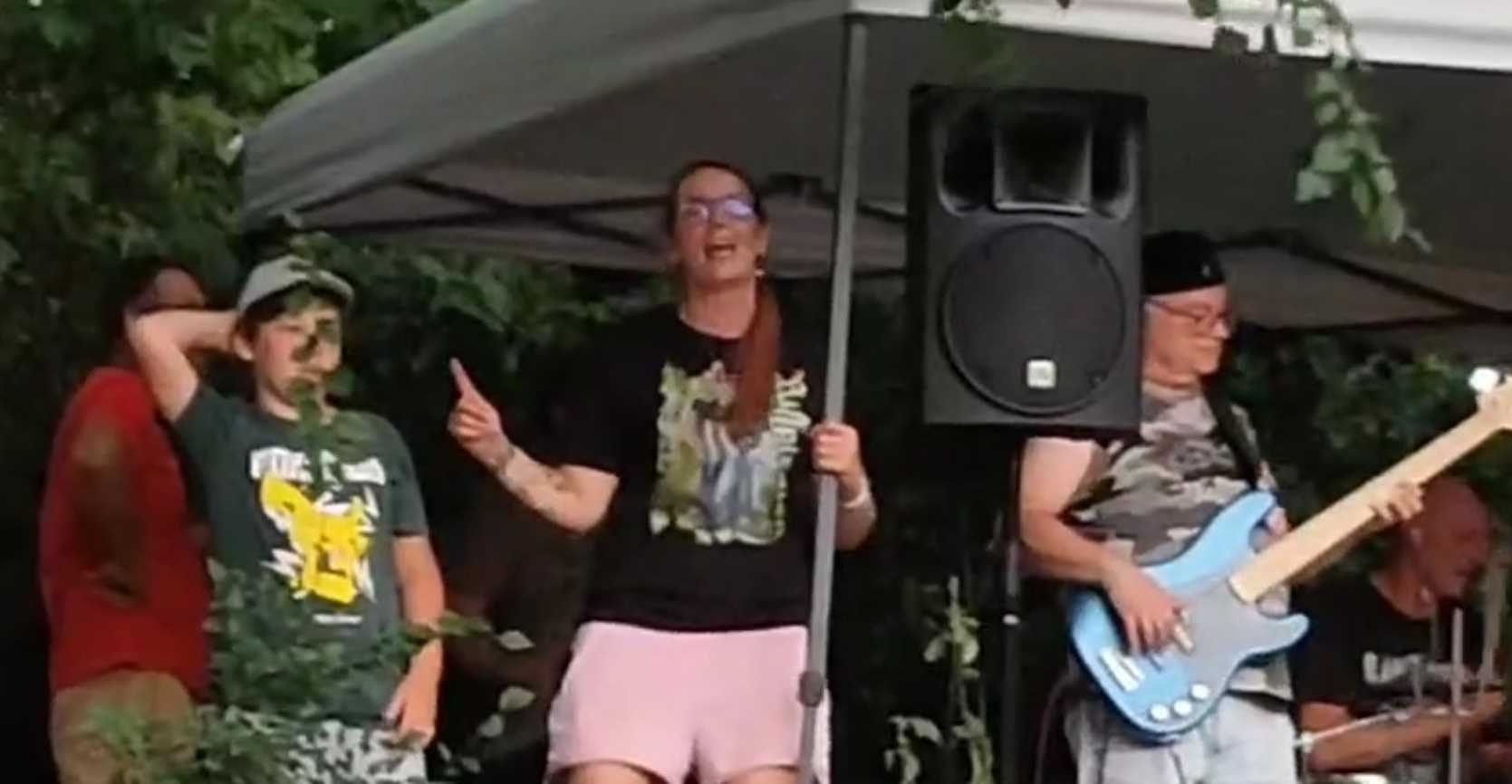 "Die Riffpiraten nehmen Baunach im Sturm", schrieb Rainer auf Telegram. Ja, und so war das dann auch. Unser Lied "Auf Kurs" mit der Textzeile "Wir liegen hart im Wind, solang ein Mast noch steht" sangen wir just zu Beginn des Unwetters. Der scharfe Wind peitschte den Regen horizontal unter den kleinen Pavillon und rüttelte an der Überdachung. "Der größte Fan der Riffpiraten", Isabell, so wie es auf dem Rücken ihres neuen T-Shirts steht und Tobias eilten zu Hilfe und hielten die Pfosten des nicht gesicherten Unterstands fest, damit er nicht wegflog. DJ Caress rückte sein teures Equipment weiter in den Pavillon hinein, während wir im prasselnden Regen "Auf Kurs" zu Ende spielten. Dann brach Hektik aus, denn die mitgebrachten, großen Plastikbags mussten über die PA, den Mixer und die Verstärker gestülpt werden. Rainers E-drums haben ganz schön Schlagregen abbekommen, vor allem musste er das Soundmodul schützen.